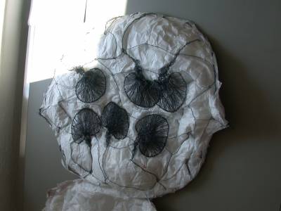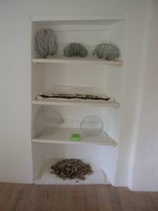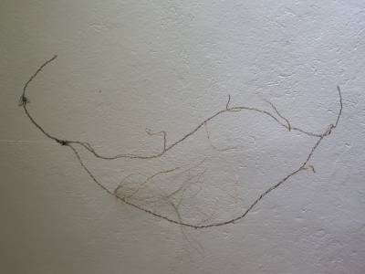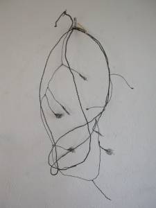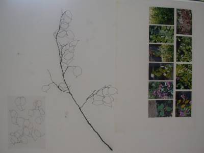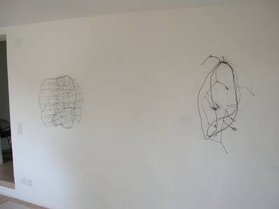 In Bedigliora war es aber, als sie im April ankam, nass. Monika Brun hat kaum Frassspuren an Blättern gefunden. Aber ihr fielen die Mondviolen auf. Die zeichnete sie zuerst. Dann entstanden räumliche Arbeiten dazu mit Schnur, Draht, Klebstreifen. Monika Brun zeichnet, abstrahiert, spielt mit den Formen.