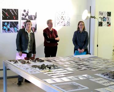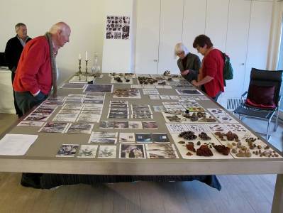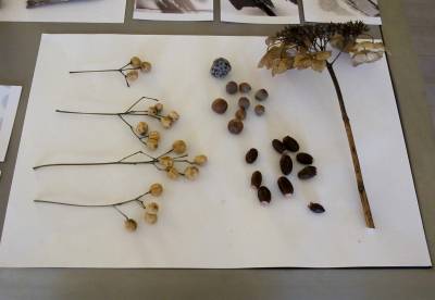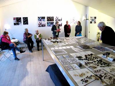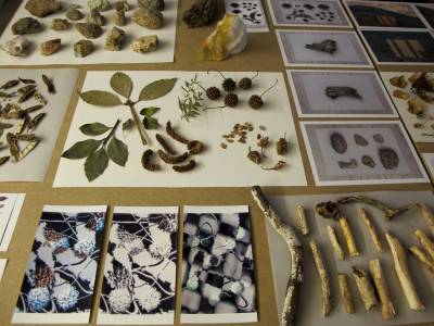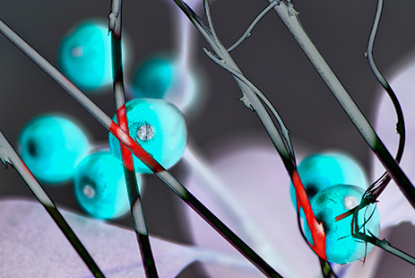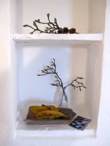 Aber Sacha Ineichen blieb nicht nur im Haus und beobachtete den Lichteinfall und die Spiegelungen an den Fensterscheiben, sondern sie machte auch ausgedehnte Spaziergänge und erkundete die Umgebung. Dabei steckte sie immer eine Plastiktüte ein, in der sie Fundstücke nach Hause brachte: Hortensienblütenblätter, Winterbeeren auf dem Waldboden, Fichtenzapfen und feine Zedernzweige, Steine und Holzstücke. Eine Auslageordnung ist im obersten Stock zu sehen. Da entdeckt man plötzlich mit Verblüffung die Modelle für viele Bilder, die man gar nicht erkannt hatte. Einerseits weil die Fotografin sie mit dem Makro aufgenommen hat und sie daher in Übergrösse zu sehen sind, andrerseits weil Sacha Ineichen mit Doppelbelichtungen und Überblendungen arbeitet, und so Objekte kombiniert oder Formen sich überlagern lässt. Und schliesslich bearbeitet sie die Bilder mit Photoshop und verfremdet die Farben, wie im Bild auf der Einladungskarte: Die kleinen roten Beeren der Stechpalme werden gross und blau. Dazu kombiniert sie Glyzinienranken, die sie stellenweise über dem Blau der Beeren rot eingefärbt hat.