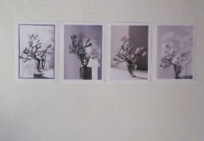 Nach Bedigliora kam Sacha Ineichen ohne ein spezielles Projekt. Sie freute sich vor allem darauf, drei Monate in inspirierender Umgebung voll für die eigene künstlerische Arbeit einsetzen zu können. Anfang Januar wurden im Haus gerade Malerarbeiten verrichtet. Die Fotografin verzog sich in den obersten Stock und machte ihr erstes Bild: Es war der Schatten der Atelierküche auf der Wand. Und schon war sie mitten in ihrem Thema, das sie nicht loslassen sollte: «Verschmelzen von Licht und Schatten», so heisst ihre Ausstellung. Da werfen Blumensträusse in Vasen grosse Schatten auf die Wand mit ihrer porösen Struktur. Das Objekt selbst ist oft gar nicht zu sehen, nur sein Schatten, der je nach Distanz des Objektivs schärfer oder unschärfer erscheint. Dabei versuchte sie selten, den Schatten künstlich zu erzeugen – was sie packte, das war der natürliche Schatteneffekt der Wintersonne, die flach durch die Fenster fiel. Es ist gar nicht leicht, den Schatten ganz allein zu fotografieren, es erfordert einige Verrenkungen und Spezialpositionen.