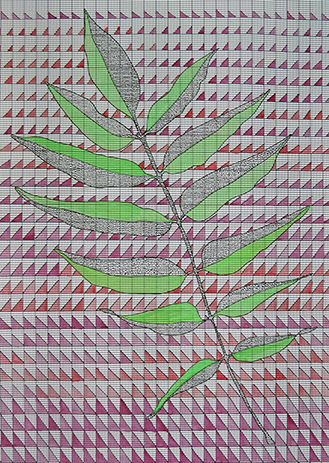4. Die Künstlerin greift auf das Handwerk zurück, verändert es aber auch. Zu den geometrischen Formen (Dreiecken und Rechtecken) auf dem Patronenpapier gesellen sich organische: so legt sich ein Glyzinienblatt auf das Millimeterraster, wie beim Bild für die Einladungskarte, ein riesiger roter Peperone, oder die Rundungen eines nackten Frauenkörpers. Mit der sorgfältigen Planung des Handwerks kontrastieren Bilder, die eher skizzenhaft hingeworfen sind, wie die Papierbahnen mit den Zeichnungen einer schlafenden Katze und verschiedenen Studien von runden und eckigen Formen.