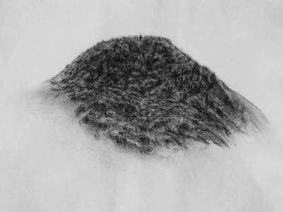 Nicht immer arbeitet die Künstlerin mit Fotografie. Sie stellt die Staffelei auch direkt vor den Monte Mondini und wirft mit mutigen Stichen Umriss und Struktur aufs Papier – aus dem harmlos geglaubten Hügelrund wird eine Symphonie aus Klüften, Bergfalten und Wirbeln.
