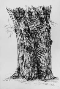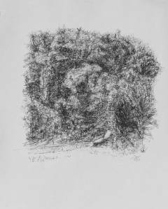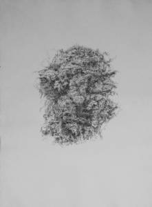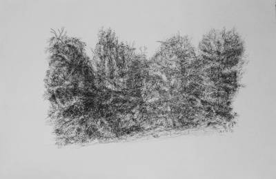 Sie fotografiert die Baumgruppe, legt ein Raster über das Bild und zeichnet Quadrat um Quadrat, ohne den Blick für das Ganze zu verlieren. Geduldig und beharrlich geht ihr Strich den Verästelungen und dem Blattwerk nach. Erstaunlicherweise erwachsen gerade aus diesem genauen Zeichnen nach Vorlage abstrakte Formen. Im Bekannten entsteht etwas Fantastisches: Gesichter blicken aus dem Geäst, geisterhafte Gestalten tauchen darin auf und ziehen die Betrachter in den Strudel ihres Tanzes. Die einzelnen Figuren setzen sich zu einer neuen Komposition zusammen, wie bei Arcimboldo die aus Früchten oder Gemüse zusammengesetzten Gesichter.