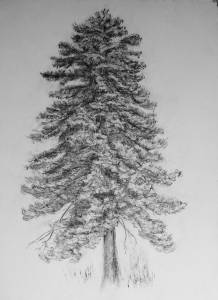 Christine Brady faszinieren die Bäume als Verbindungsglied zwischen Himmel und Erde. Sie verwandeln die Energie der Sonne, greifen wie mit Händen in den Boden, schiessen hoch auf mit unerhörter Wucht. Ihre Einzelporträts der Bäume zeigen diese Bewegung und Verwandlungskraft: Das sind die lang ausgestreckten Wurzeln, die wie Tier-Arme behaarten Stränge, oder da ist die geballte Kraft der Kastanie, die direkt aus dem Boden bricht und das Blatt zu sprengen scheint. Mit dem Radiergummi kontrastiert die Künstlerin die schwarzen Kohlestriche. Durch das Anfügen und Wegnehmen, durch Einzelstriche und Schraffierungen entstehen atmosphärische und perspektivische Tiefen.