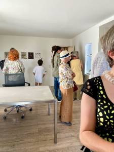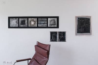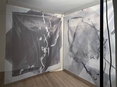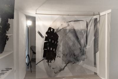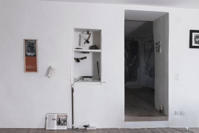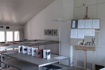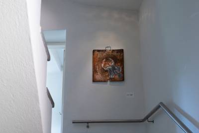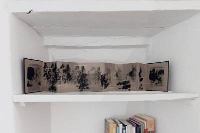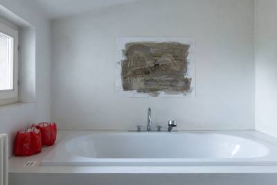 Die Szenografin merkt man ihrer Ausstellung an, die nicht nur das ganze Haus in allen seinen Räumen bespielt, von der Küche über das Badezimmer und den Schlafraum bis in die Ateliers beider Stöcke, sondern auch noch den Aussenraum (die ehemalige Waschküche und sogar den Garten). So vielfältig wie die Räume sind auch die Techniken und Formate: von der Rauminstallation zum Diorama und zur Filmprojektion mit Musik, von Bildern, die Malerei, Fotografie und digitale Bildbearbeitung vereinen zu Textildrucken und Hinterplastikmalerei. Die Künstlerin kombiniert Tusche mit Akryl, Kreide und Graphit, sie druckt mit einer Rolle auf Leinwand, sie klebt Collagen und Halbreliefs, sie malt mit Tipp-Ex auf Papier, inszeniert objets trouvés und gestaltet Leporelli.