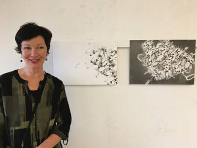 Sie beschäftigt sich eingehend mit der Pflanze, fotografiert sie, projiziert die Bilder, zeichnet die Blüte vielfach vergrössert, umgekehrt im Hochformat. Dabei wiederholen sich Grundformen auf immer andere Art. Die Künstlerin zeichnet jede Form einzeln. Sie identifiziert sich stark mit den Pflanzen, sieht Arme, Hütchen, eine ganze Geschichte darin. Ziel des mehrfachen Zeichnens ist es, immer freier zu werden. Mit der Zeit zählt die Bewegung mehr als das Motiv. Für Lis Blunier ist es wichtig, in Serien zu arbeiten. Was geschieht, wenn die Formen einander durchdringen, wenn zwei Blüten zusammengesetzt werden und so ein neues Gebilde entsteht? Wie wirken sie von Schwarz umschlossen, wie als minimalistisches Bild im Nebel, wenn die Formen nur noch angedeutet sind, aber doch noch Leben da ist? Die Bilder einer Serie steigern sich, bereichern sich gegenseitig. Es gibt einen Star, einen Anführer, doch es braucht auch ein Gleichgewicht.