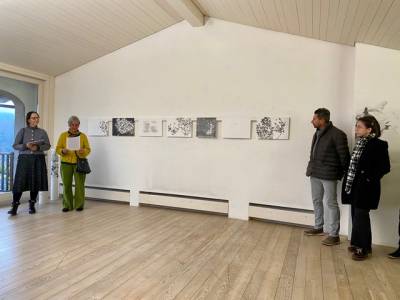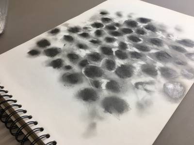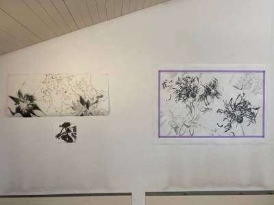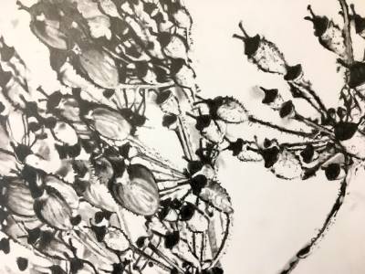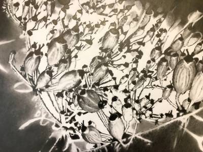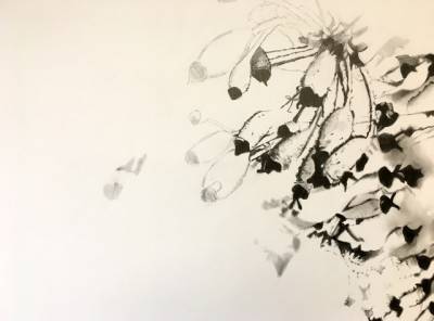 Gegenüber dem Naturdruck ist das Zeichnen mit Graphit auf Papier eine Technik, bei der weniger dem Zufall überlassen bleibt, es wird mehr gestaltet. Lis Blunier trägt den Graphit auf und verreibt ihn mit Wattestäbchen. In Bedigliora fand sie ein neues Motiv: den Wiesenbärenklau im verblühten Stadium. Sie liebt verblühende Pflanzen, auch Tulpen, bei denen die Blätter sich verformen. In Bedigliora hat sie sich noch mit anderen Pflanzen beschäftigt, Bergheideröschen, Akeleien, Flockenblumen. Das Unspektakuläre und das Kleine fasziniert sie besonders: Blütenstaub auf einem Blatt Papier, Samen, die nach der Blüte übrigbleiben. Sie bekommen ein Eigenleben, zeugen von Sinnlichkeit.